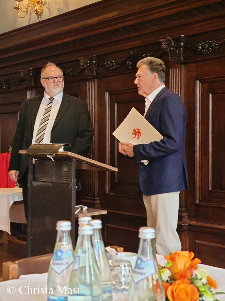 Oberbürgermeister Jürgen Dupper verleiht Herrn Reinhold Mast die Ehrennadel der Stadt Passau für ehrenamtliche Tätigkeit. Herr Mast war von 1992 bis 2014 2.Vorsitzender unseres Freundeskreises, seitdem ist er im Beirat vertreten. Daneben war er jahrelang maßgeblich im Förderverein Oberhausmuseum und im Museum selber tätig.