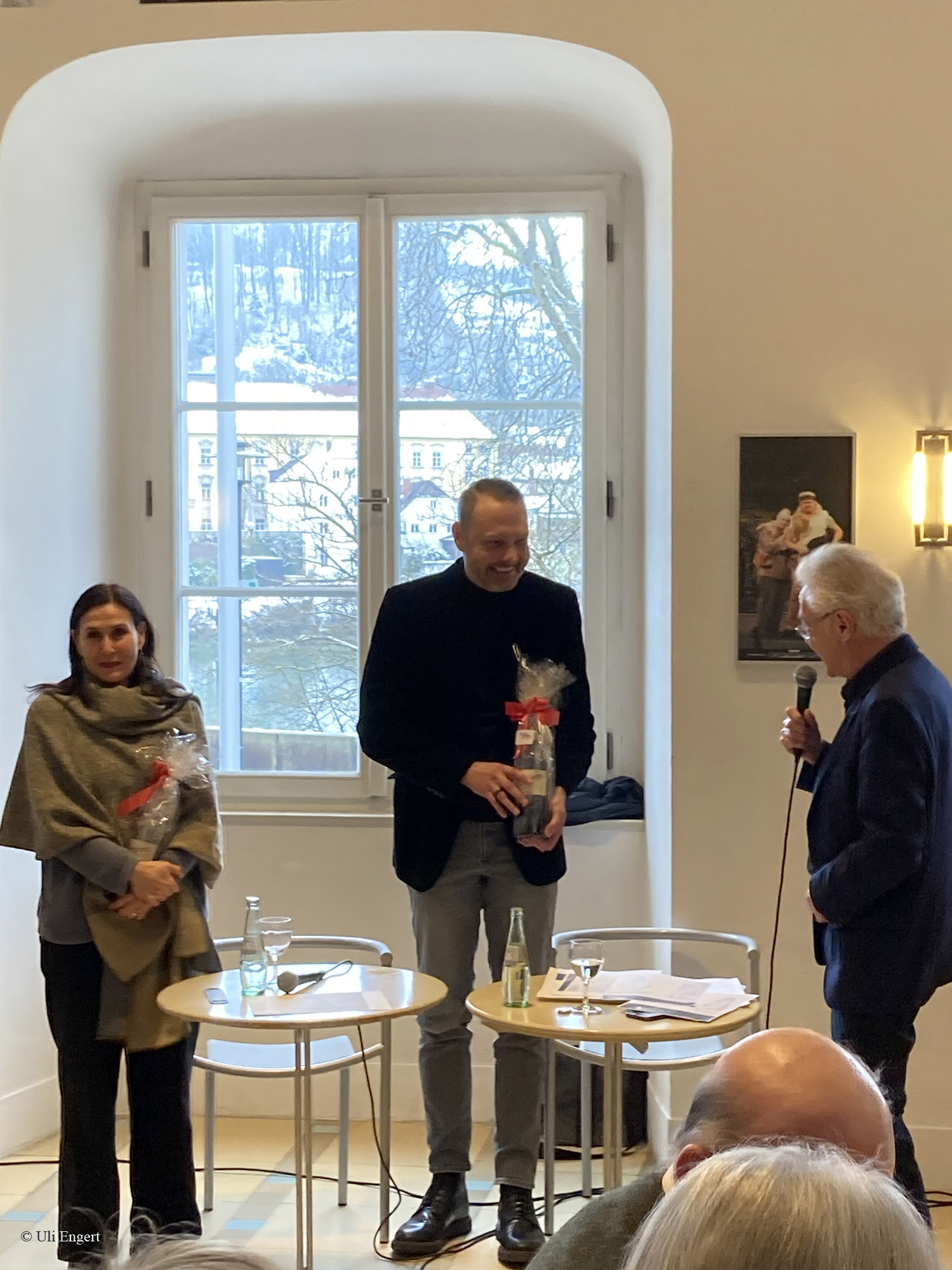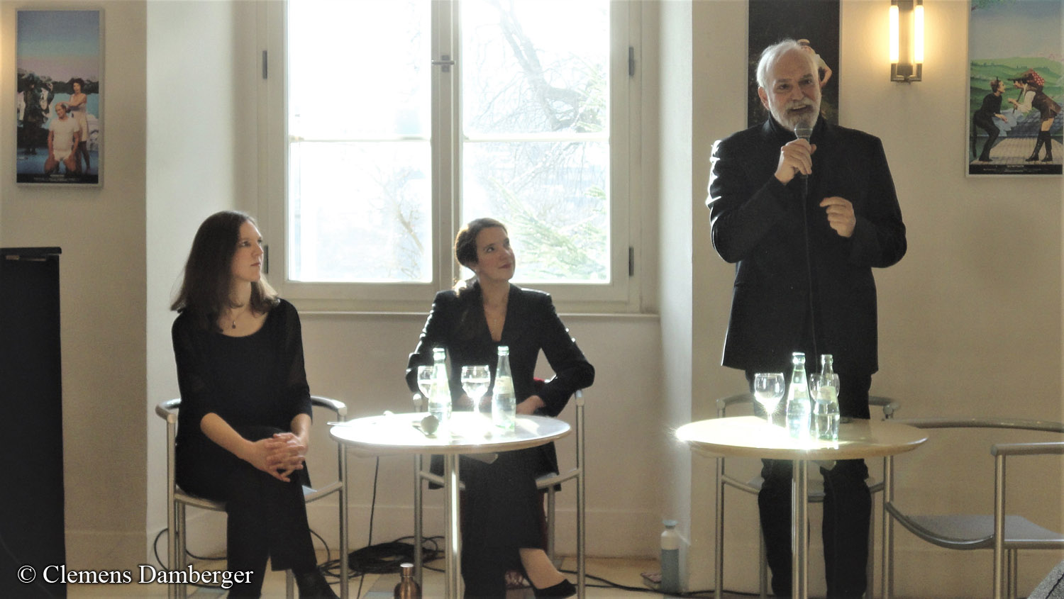 Die Mezzosopranistinnen Juliane Wenzel (Goffredo) links im Bild und Sabine Noack (Rinaldo) gaben musikalische Kostproben aus der Oper von Georg Friedrich Händel. Der Regisseur Kobie van Rendsburg erläuterte sein besonderes Konzept: Es wird das Bluescreen-Verfahren eingesetzt, in dem Sängerinnen und Sänger gefilmt und zeitgleich in eine virtuelle Welt hinein projiziert werden. So kann eine barocke Darstellung mit zeitgemäßen Mitteln realisiert werden – technisch kompliziert und sehr anspruchsvoll.