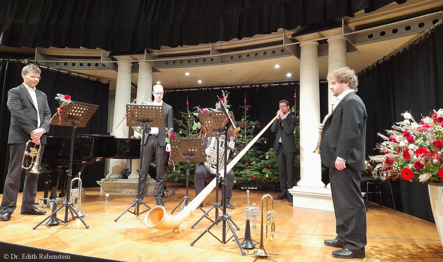Das Bläserensemble v.l.: Michael Lakota (Trompete), Konrad Probst (Horn), Elmar Walter (Tuba) verdeckt, Sebastian Sager (Alphorn/Posaune), Franz X. Tradler (Trompete). Sie spielten Werke des Chiemsee-Komponisten Johann Kröll (Der Grassauer Walzer, Hört`s Leitl, Bergluft), aber auch amerikanische Weihnachtslieder.
