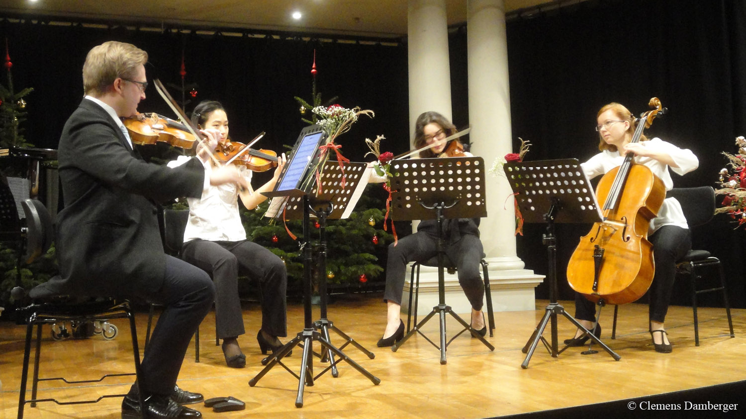 Im Foto v.l.: Patrick Vida (Violine), Lee Young Kim (Violine), Vinciane Vinckenbosch (Viola) und Constanze Wolf (Violoncello). Das Streicherquartett spielte einen klassischen Höhepunkt der Kammermusik: Den ersten und zweiten Satz aus „Der Tod und das Mädchen“ von Franz Schubert. Nach dem Abendessen (Bewirtung durch das Team der Theaterwirtin) trug der langjährige, ehemalige Vorsitzende Werner Reinisch die Kurzgeschichte „Die Weihnachtsmaus“ vor – ein Kult bei jeder Weihnachtsfeier der Theaterfreunde.