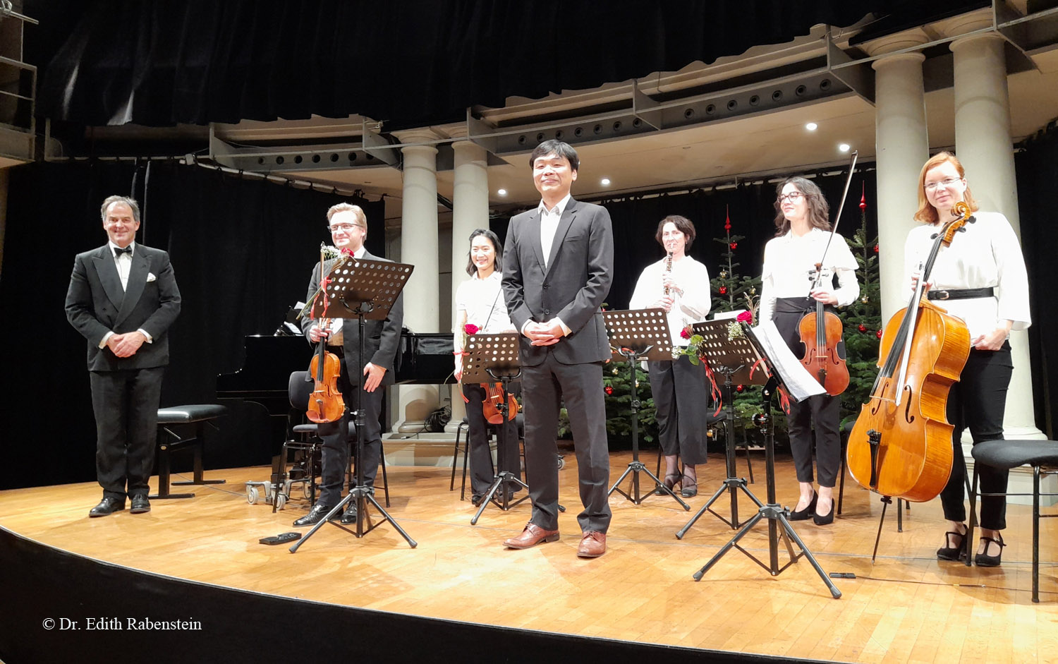 Im Foto v.l.: GMD Basil H. E. Coleman (Klavier), Patrick Vidal (Violine), Lee Young Kim (Violine), Heeyun Choi (Bass), Margret Schlootz (Oboe), Vinciane Vinckenbosch (Viola), Constanze Wolf (Violoncello). Zum musikalischen Abschluss und Höhepunkt der Feier sang der beliebte Bass unseres Theaters Heeyun Choi Arien aus den Opern „Don Giovanni“, „Die Hochzeit des Figaro“ und „Schweigsame Frau“. Nach „I was born under a wand`rin star“ das weihnachtliche Finale: „White Christmas“. Mit lang anhaltendem Applaus dankten die Theaterfreunde ihrem Ensemble für einen wunderbaren, stimmungsvollen Abend im Advent.