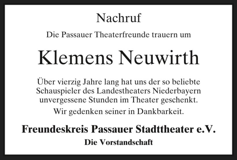 Der Schauspieler Klemens Neuwirth war seit 1981 Ensemblemitglied der Schauspielsparte unseres Landestheaters in Landshut. Herausragende Rollen unter vielen anderen waren hier: „Faust“, Lenny in „Von Mäusen und Menschen“, Willy Lohmann in „Tod eines Handlungsreisenden“, „Wilhelm Tell“, „Brandner Kaspar“. Zuletzt wirkte er in dem Film „Die Ehe des Herrn Bolwieser“ mit, der im Stadttheater Passau noch bis 01.06.23 zu sehen ist.