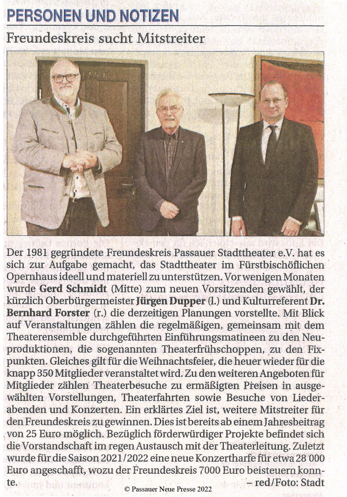 Der im Mai dieses Jahres neu gewählte 1.Vorsitzende des Freundeskreises Passauer Stadttheater e.V., Gerd Schmidt, stellt sich dem Oberbürgermeister der Stadt Passau vor. Zusammen mit dem Kulturreferenten Dr. Bernhard Forster nahm sich Hr. Jürgen Dupper – selbst Mitglied der Theaterfreunde – sehr viel Zeit um über die Ziele des Vereins, Förderprojekte zugunsten des Theaters, die beliebten Veranstaltungen wie Theaterfrühschoppen etc. zu diskutieren. Hr. Dupper als „bekennender Theaterfan" zeigt sich am Vereinsleben des wohl größten kulturellen Vereins der Stadt besonders interessiert. Gerd Schmidt sprach auch die Sorgen der Passauer Theaterfreunde um das Stadttheater Landshut an.